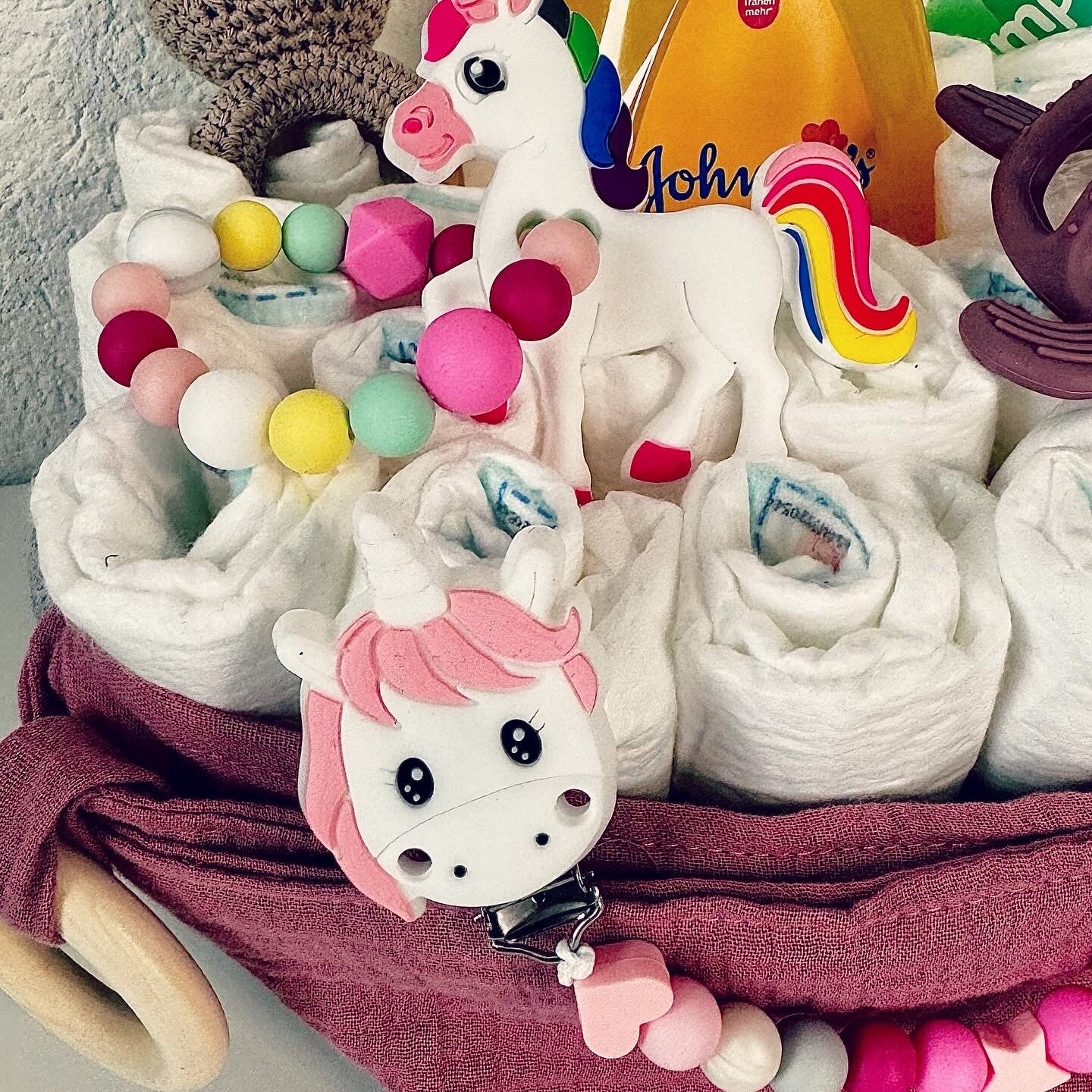Entdecke die Magie der Windeltorte Einhorn – eine bezaubernde Zusammenstellung aus 22 Pampers Windeln der Grösse 2 Premium Protection oder Grösse 3 Babylove in einem stilvollen, grauen geflochtenen Stoffkorb.Die Windeltorte Einhorn ist nicht nur praktisch, sondern auch ein liebevolles und zauberhaftes Geschenk für werdende Eltern.